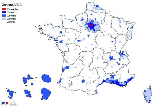 Zone A : agglomération de Paris (dont zone Abis), la Côte d’Azur, la partie française de l’agglomération genevoise, certaines agglomérations ou communes où les loyers et les prix des logements sont très élevés ;